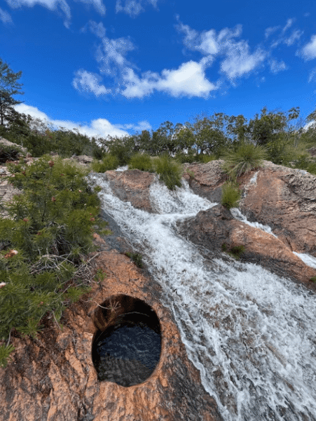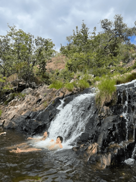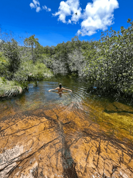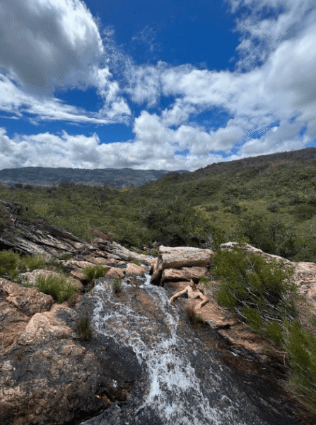 Durante todo o percurso, a exposição ao sol é constante, sem nenhum ponte de água até chegar na cachoeira. A vegetação local também é muito bonita e é importante perceber que ao longo do dia a paisagem muda completamente tendo em vista a diferença da incidência de luz solar.