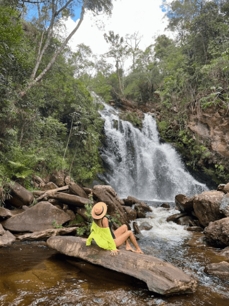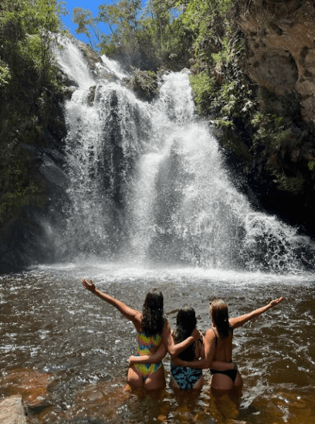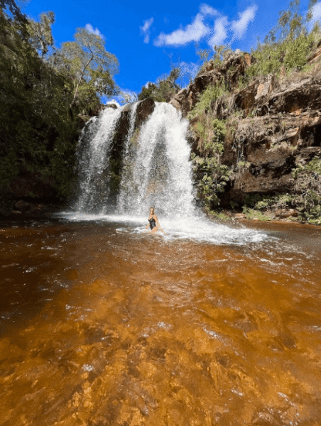 Na cachoeira Ouro Fino, é possível chegar na queda caminhando com água próximo joelho. Roteiro indicado também para crianças.