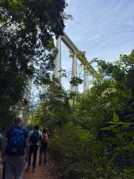 Ao longo da caminhada, a gente sente na pele a mudança de ambiente: começa no alto da serra, desce por trilhas de terra, passa por antigos trilhos de trem.